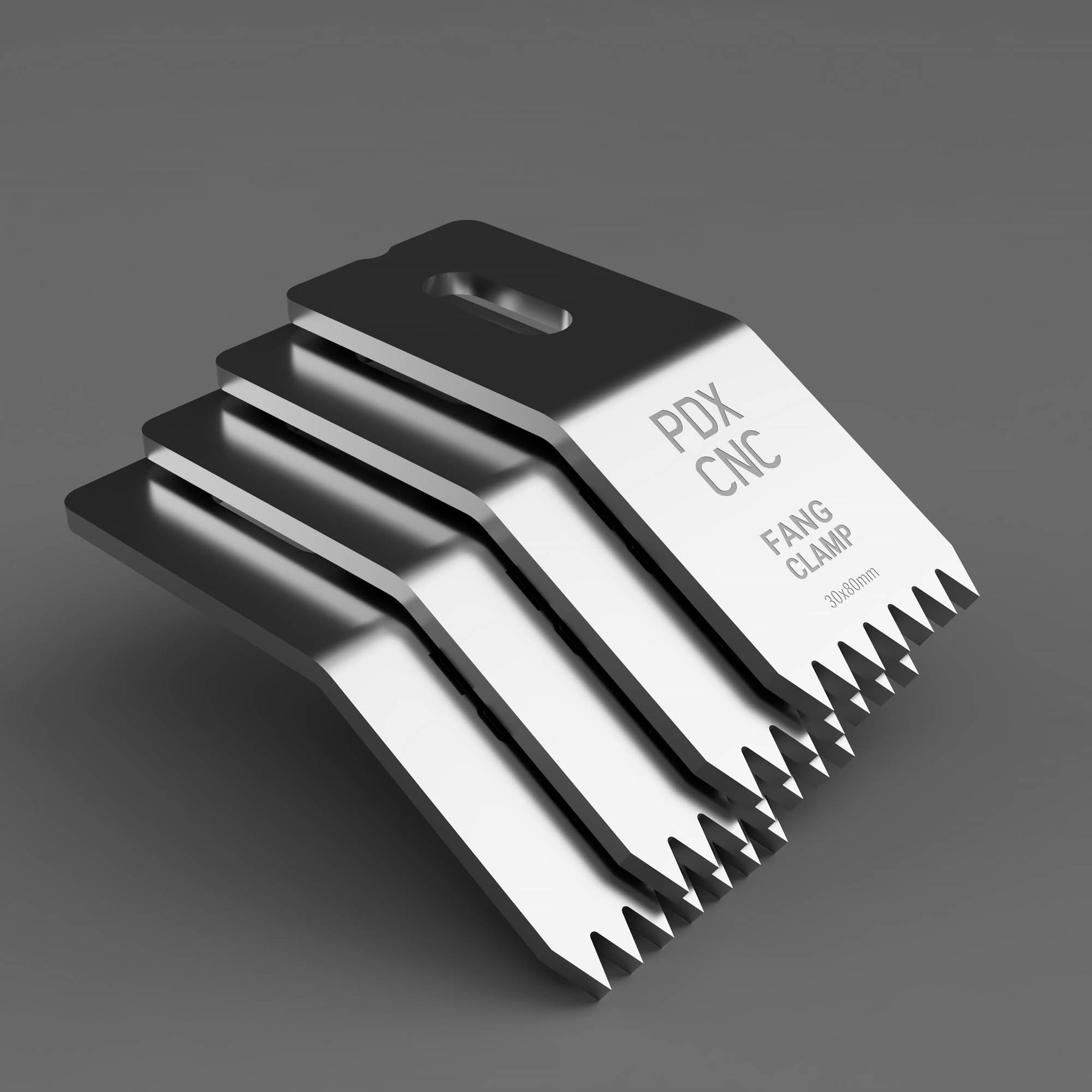 The Fang Clamp is a stainless steel side-bite hold-down built for jobs where vacuum isn’t an option. It drives teeth into the edge of your material, locking parts from the side and keeping them put even when the bottom side is uneven or rough. Use them on CNC router spoilboards or fixture plates with 1/4-20 or M6 screws for quick setups.